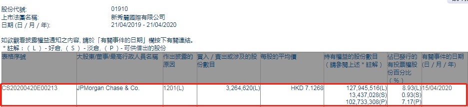 智通财经APP获悉,联交所最新资料显示,4月15日,摩根大通减持新秀丽(01910)326.462万股,每股作价7.1268港元,总金额约为2326.63万港元。减持后最新持股数目约为1.28亿股,最新持股比例为8.93%。