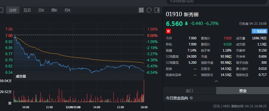 截至今日收盘,新秀丽跌6.29%,报6.56港元。