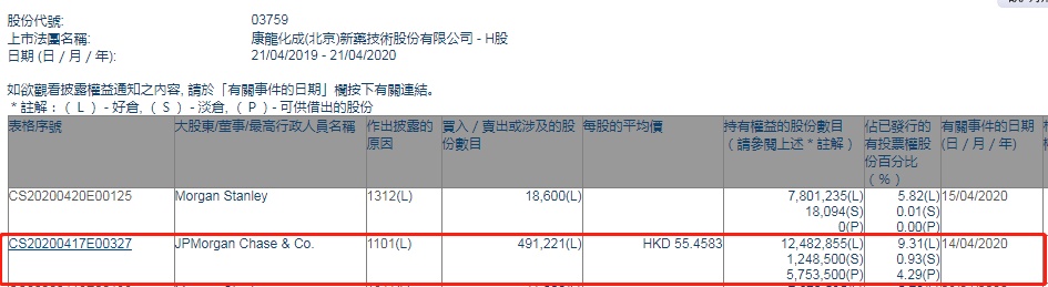 智通财经APP获悉,联交所最新资料显示,4月14日,摩根大通增持康龙化成(03759)49.1221万股,每股作价55.4583港元,总金额约为2724.23万港元。增持后最新持股数目约为1248.29万股,最新持股比例为9.31%。