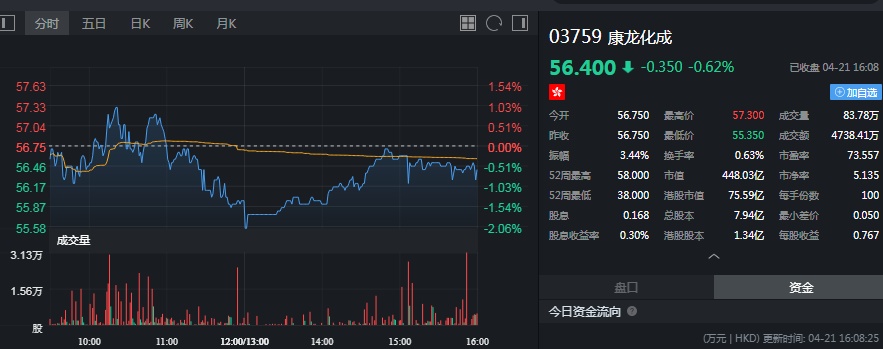 截至今日收盘,康龙化成跌0.62%,报56.40港元。