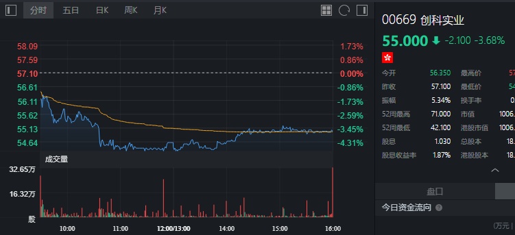 截至今日收盘,创科实业跌3.68%,报55港元。
