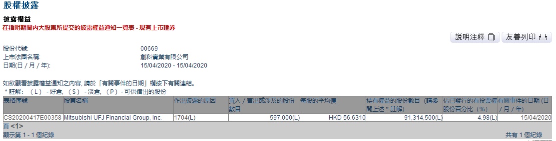 智通财经APP获悉,联交所最新资料显示,4月15日,三菱日联金融集团减持创科实业(00669)