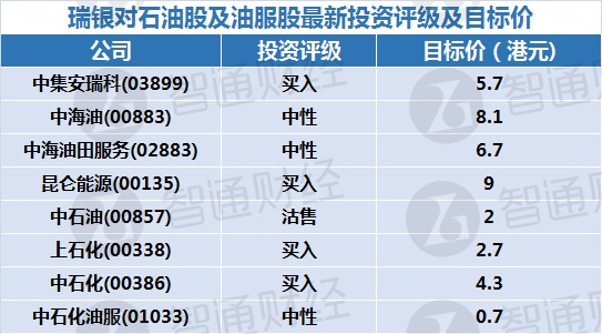 智通财经APP获悉,瑞银发布报告称,更新对石油股及油服股最新投资评级及目标价,如下表: