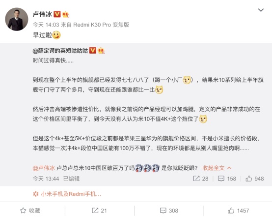 2020年4月21日,小米集团(01810)副总裁、中国区总裁卢伟冰通过微博确认,小米10系列国内销量已经突破100万台。小米10系列是小米手机首款正式冲击高端的产品,全系标配骁龙865、LPDDR5、UFS