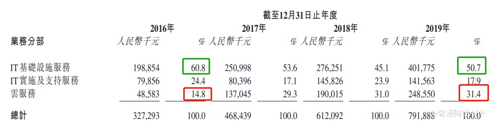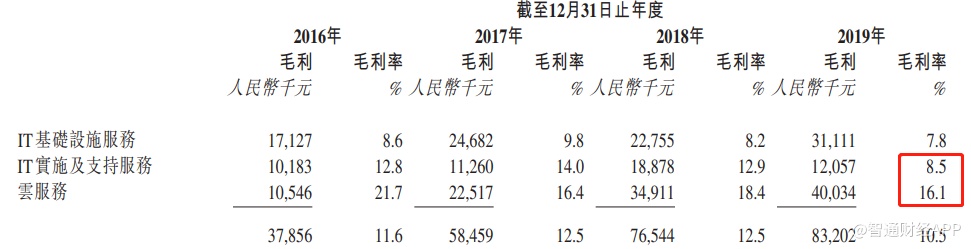 从业务的描述也能感受到各业务的技术含量,IT基础设施服务即中间商业务,对接软件、硬件的提供方和需求方,并从中赚取差价。而IT实施及支持服务则是基于软件、硬件的IT解决方案,有一定技术溢价,可获得比IT基础设施服务更高的毛利率。云服务则是三项业务中技术含量最高的。