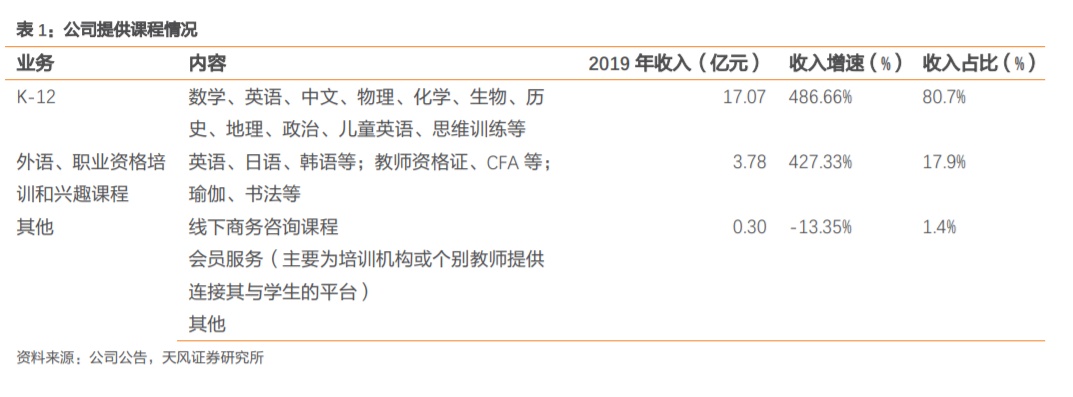 亿元,+413%yoy,超此前指引上限,主要系公司教学经验和技术资源的积累。2019 年收入 21.1 亿元,+432%yoy。公司连续 5