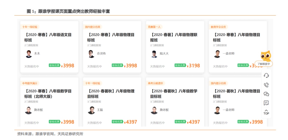 年以上教学经验,且均在自己擅长的学科或某学科某类学习技巧方面有突出成就,获得一定奖项或头衔。跟谁学跟谁学报课页面重点突出教师经验丰富,采用“十年一线”、“提分名师”、“竞赛第一人”、“高考分”、“网红名师”等吸睛关键词为老师贴牌背书,增强名师的可信度。