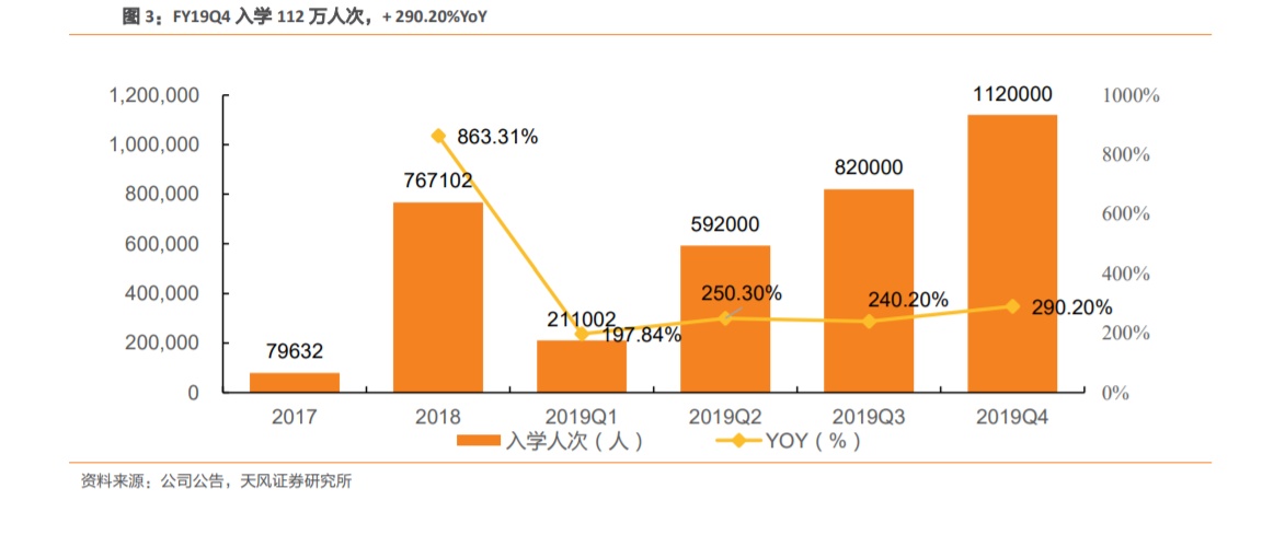 FY19Q4 入学 112 万人次,+ 290.20%YoY;FY19 入学 274.3 万人次,+257.6%YoY。