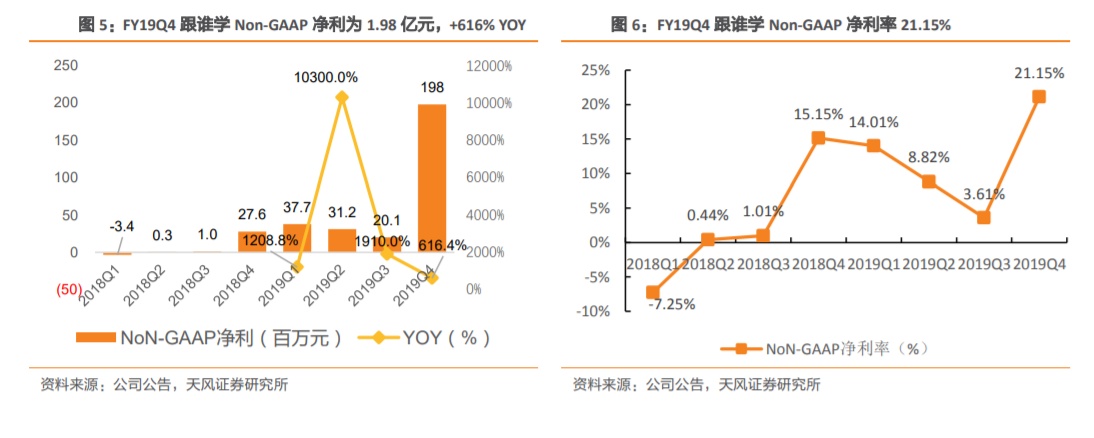 获客成本较低:经验丰富的老师模式带来高客单价以及高转化率、高续报率。凭借优质课堂带来的高转化率和续报率,跟谁学的获客成本较低。同时超大班模式使得公司试听课边际教师成本几乎为零,基本不存在 20 人班课或者 1V1 模型下试听课教师成本高和管理难的问题。连续 7 个季度 Non-GAAP 盈利。19Q4Non-GAAP 净利 1.98 亿元,+616.7%yoy。2019 年 Non-GAAP 净利 2.87 亿元,+1021%yoy。公司采用优化单个模型后规模化的策略,连续 7 个季度 Non-GAAP 盈利。我们认为公司的竞争优势是专注于在线大班班型,不断增强组织能力、有效执行策略、提升运营效率。