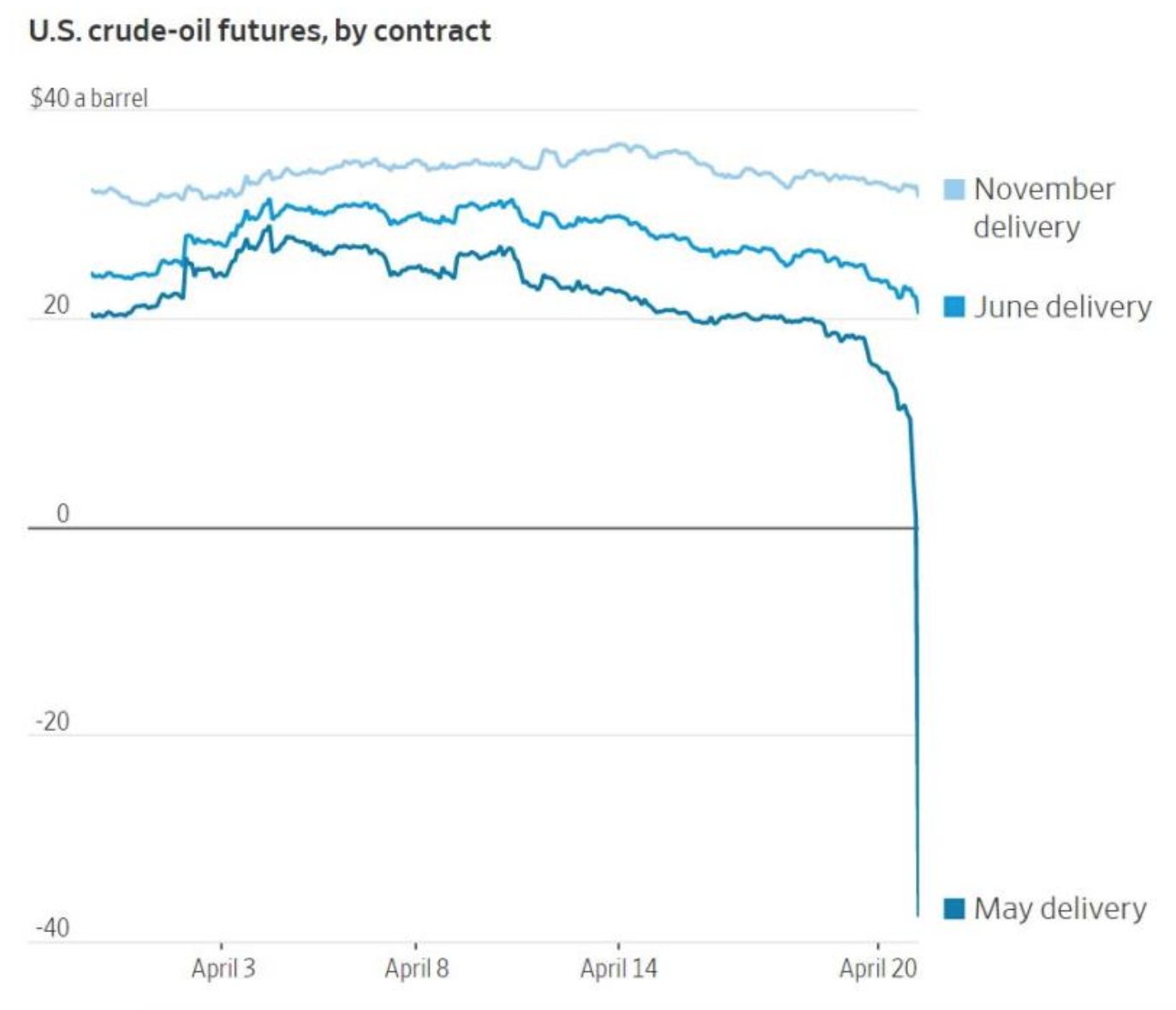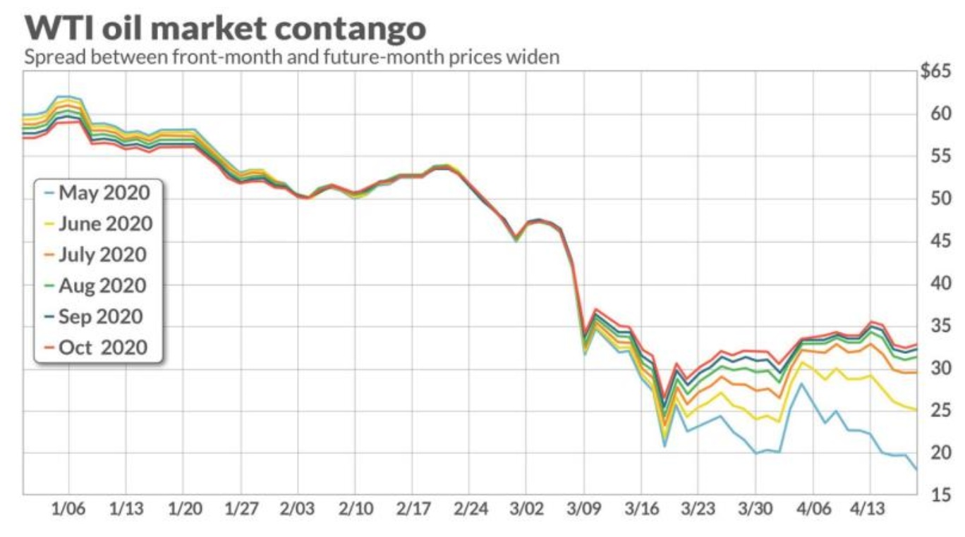 4月20日,五月份交割的美油期货合约价格收于负37.63美元/桶,这实际上意味着卖主必须向买主付钱才能脱手。6月美油期货合约仍处于正区域,4月20日收于20.43美元/桶,而11月美油期货合约收于约31.66美元/桶。