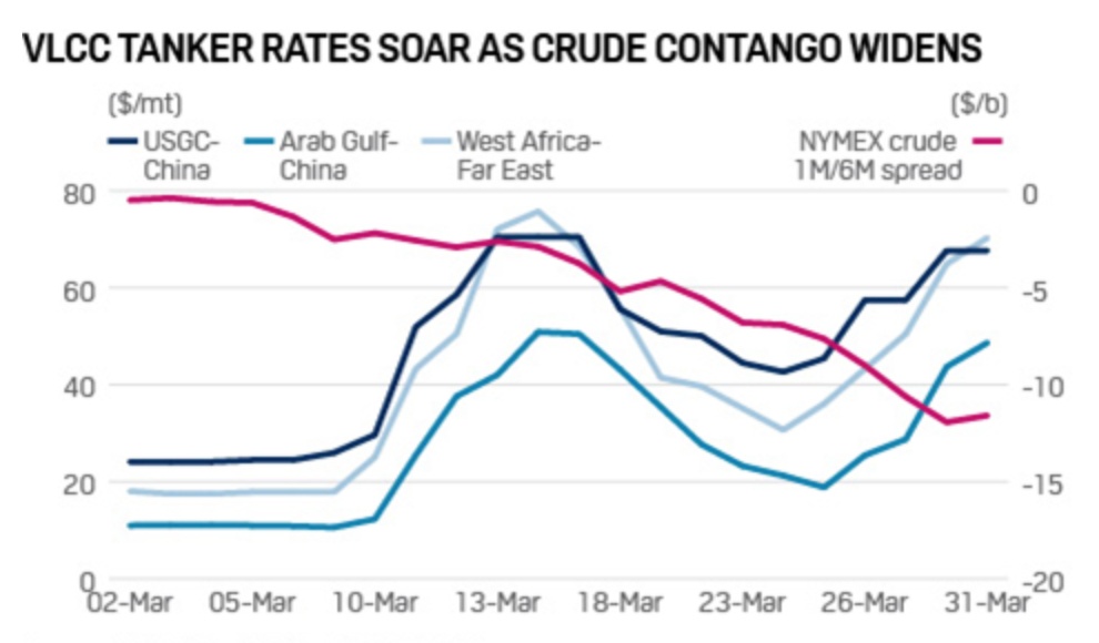 原油期货市场溢价为交易员提供了难得的机会,他们通过油轮等储存设备存储原油,并在未来价格上涨时出售。而这也意味着对原油储存设备的需求提升,抬高了原油的储存成本。