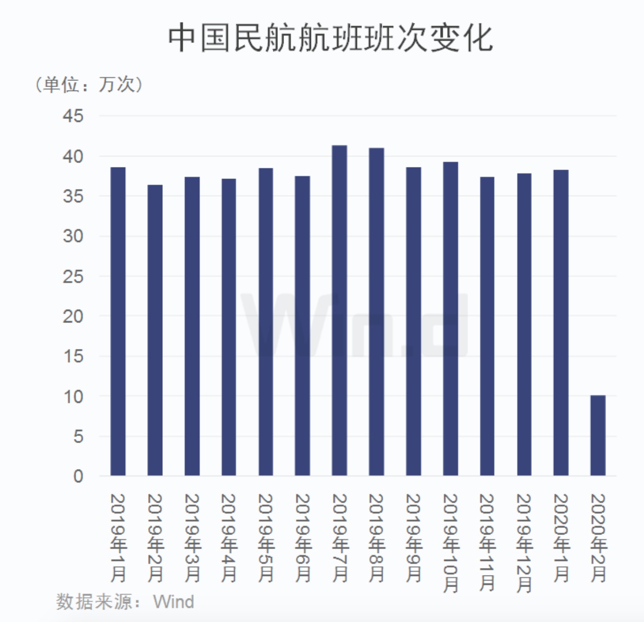 虽然我国当前公共卫生事件得到较好的控制,但前两个月同样付出了很大的经济代价。事实上,从我国航班班次变化亦能感受到行业冷暖,2019年全年每月民航航班班次均在35万次以上,今年一月份尚未看出明显变化,而2月份就骤降至10万次,下降比例超过70%,不仅民航如此,其他交通运输领域亦存在同样情况。