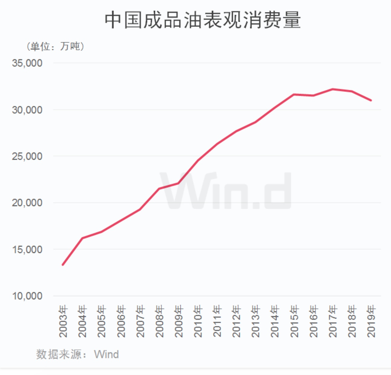 随着各种替代能源及新能源的发展,中国成品油(汽油、柴油、煤油合计)表观消费量2016年以来连续多年高位滞涨,而在2015年之前的10多年均保持快速增长。2018年和2019年中国成品油消费量虽然均超过3亿吨,但却呈现小幅下滑趋势。