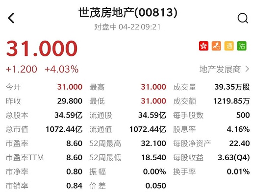 港股异动 | 拟将物业管理及相关增值服务业务分拆上市 世茂房地产(00813)高开4.03%