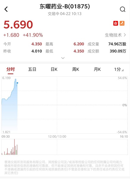 智通财经APP获悉,东曜药业-B(01875)宣布,TAB008(朴欣汀®;Pusintin®)的随机III期临床试验最近达到了预设的主要终点。该股高开高走,盘中一度涨超54%,截至发稿,涨41.15%,报5.66港元,成交额387.13万港元。