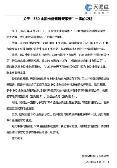 4月21日,天眼查关注到微博上“360金融准备起诉天眼查”相关话题,天眼查对此非常重视,在此作出说明。