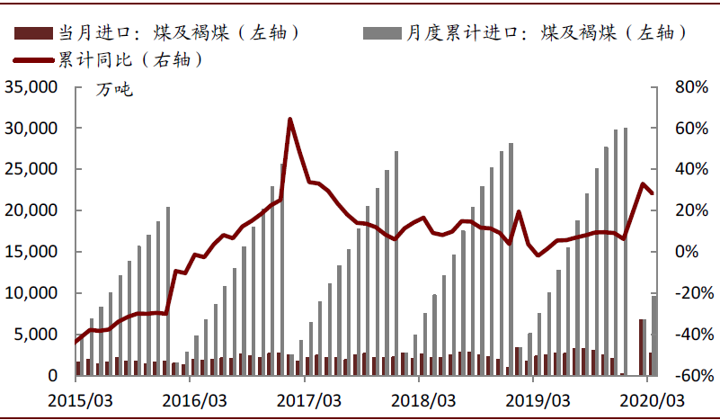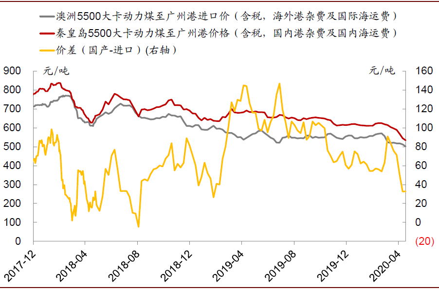 根据统计局最新数据,2020年3月全国原煤产量3.37亿吨,同比+9.6%,产量创2011年6月以来新高。1季度累计产量8.3亿吨,同比-0.5%。根据海关的数据,2020年3月我国煤炭进口量为2,783万吨,同比增长18.5%,1季度累计进口量为9,578万吨,同比+28.4%,部分可能由于去年年末部分进口推迟报关的影响。近期澳煤较国内煤炭的价格优势有所收窄,目前价格优势在33元/吨左右。