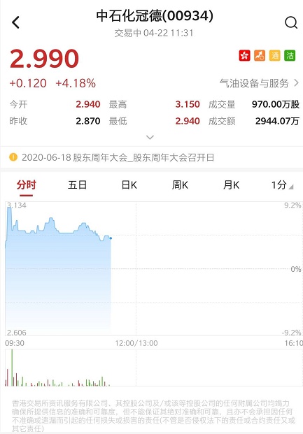 智通财经APP获悉,美国石油协会公布的数据显示,美国截至4月17日当周API原油库存增加1322.6万桶,美国原油库存连续13周录得增加。中石化旗下从事提供原油码头及储存服务的子公司中石化冠德(00934)早盘受资金追捧,盘中一度涨超9%,截至发稿,涨4.18%,报2.99港元。