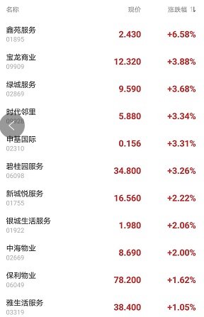 截至11时29分,鑫苑服务(01895)涨6.58%,报价2.43港元,绿城服务(02869)涨3.68%,宝龙商业(09909)涨3.88%,时代邻里(09928)涨3.34%,碧桂园服务(06098)涨3.26%,新城悦服务(01755)涨2.22%。