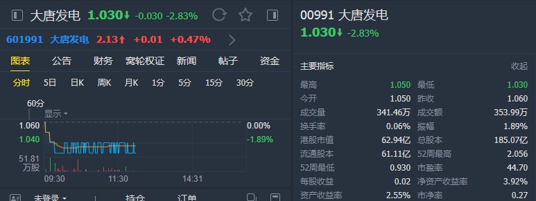 智通财经APP获悉,中信里昂发表报告,下调大唐发电(00991)目标价31%,由1.3港元至0.9港元,评级由“跑输大市”大降至“沽售”。
