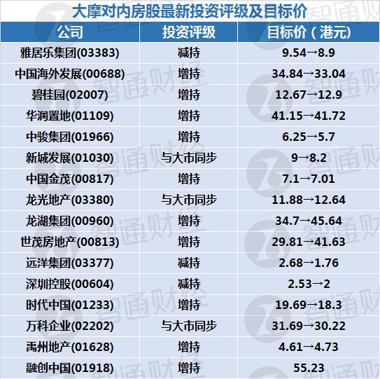 智通财经APP获悉,大摩发布报告称,更新对内房股最新投资评级及目标价,如下表: