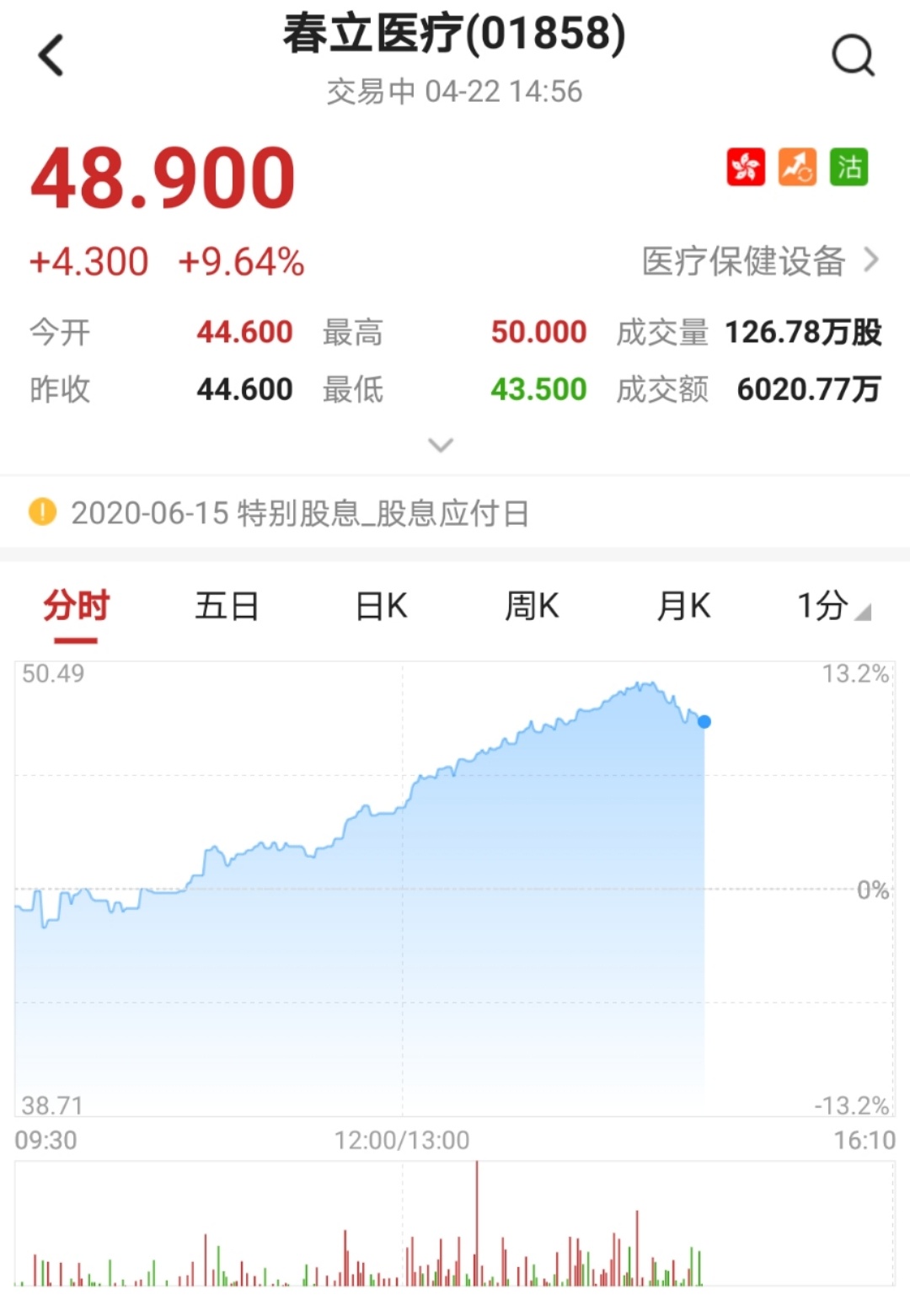 智通财经APP获悉,医疗设备板块表现强势,盘中该板块多只个股创历史新高,午后春立医疗(01858)一度涨超12%,以每股50港元再创历史新高,截至14时56分,涨9.64%,报价48.9港元,成交额6020.77万。