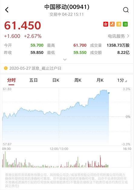 智通财经APP获悉,中国移动(00941)此前公布3月运营数据,中国移动移动用户净增413.4万户,累计达到9.46亿户。其中5G客户数大增1632.4万户,累计达到3172.3万户。中移动盘中一度涨3%,截至发稿,涨2.67%,报61.45港元。