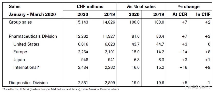 数据显示,罗氏Q1销售额为151亿瑞士法郎,以不变汇率计同比增长7%。其中,罗氏医药品部门销售额为122.6亿瑞士法郎,同比增长7%;诊断部门销售额为28.8亿瑞士法郎,同比增长5%。