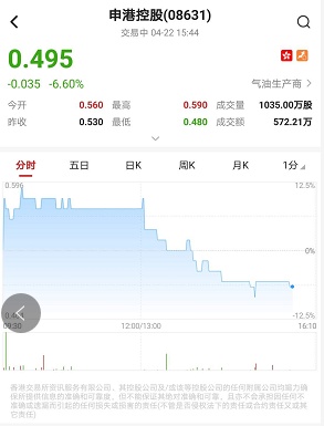 智通财经APP获悉,细价股申港控股(08631)跌势延续,昨日(4月21日)盘中曾暴跌逾40%。截至15时44分,跌6.6%,报价0.495港元,成交额572.21万。