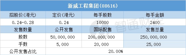 智通财经APP获悉,4月22日,新威工程集团(08616)配售结束。配售招股价0.24-0.28港元,最终定价0.24港元,每手2400港元。