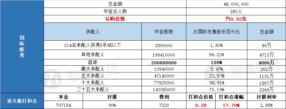 国际配售申购中签人数280,认购倍数约0.92倍。