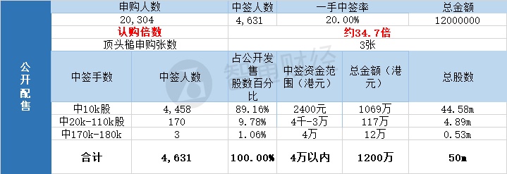 其中,公开配售申购人数20304,一手中签率20%,认购倍数约34.7倍。