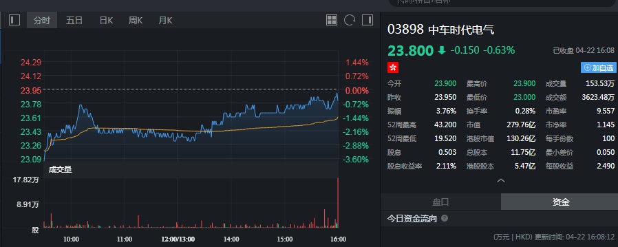截至今日收盘,中车时代电气跌0.63%,报23.80港元。