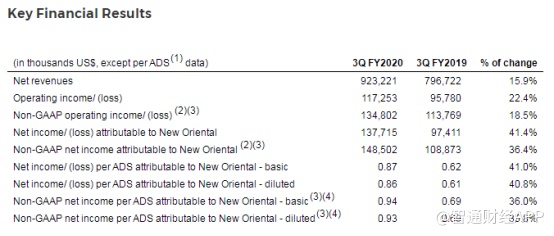 智通财经APP了解到,4月21日,新东方公布了公司2020财年Q3季度业绩。报告期内,新东方净收入达9.23亿美元,同比增长15.9%;运营利润为1.17亿美元,同比增长22.4%;当期归属于公司的净利润为1.38亿美元,同比增长41.4%。