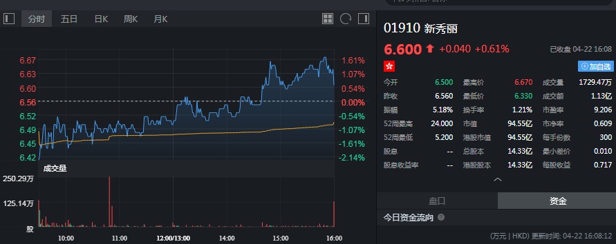 截至今日收盘,新秀丽涨0.61%,报6.60港元。