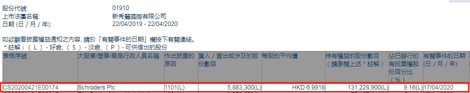 智通财经APP获悉,联交所最新资料显示,4月17日,Schroders Plc增持新秀丽(01910)588.33万股,每股作价6.9918港元,总金额约为4113.49万港元。增持后最新持股数目约为1.31亿股,最新持股比例为9.16%。