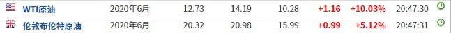 截至发稿,WTI原油涨10.03%,报12.73美元/桶。布伦特原油涨5.12%,报20.32美元/桶。