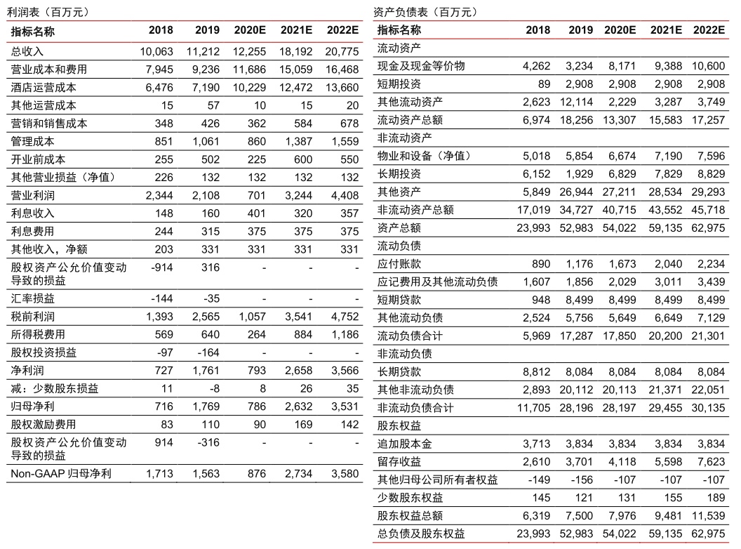 投资建议:尽管公共卫生事件影响仍待1-2个季度消化,但我们坚持看好酒店龙头在结构升级、连锁提升背景下的成长机会,随公共卫生事件影响逐渐消除、景气回升,公司将迎估值修复机会。考虑公共卫生事件影响,调整2020-22年EPS预测为2.67/8.94/12.00元(vs原2020-21年EPS预测4.00/9.72元,2022年EPS预测为新增),现价对应21年动态PE约24X、EV/EBITDA15倍,我们认为在公司加快扩张周期之下,随公共卫生事件影响消除,公司业绩将有较大的恢复弹性,建议积极配置,维持“增持”评级。
