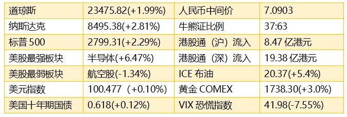 1、市场憧憬产油国或加大减产力度,油价急剧反弹逾六成,加上美国部分地区的经济重启,刺激美股集体高开高收。截至收盘,标普500指数涨62.80点,涨幅2.29%,报2799.31点;纳指涨232.10点,涨幅2.81%,报8495.38点;道指涨456.90点,涨幅1.99%,报23475.82点。港股ADR指数小幅下挫,按比例计算,收报23879点,跌13.93点或0.06%。