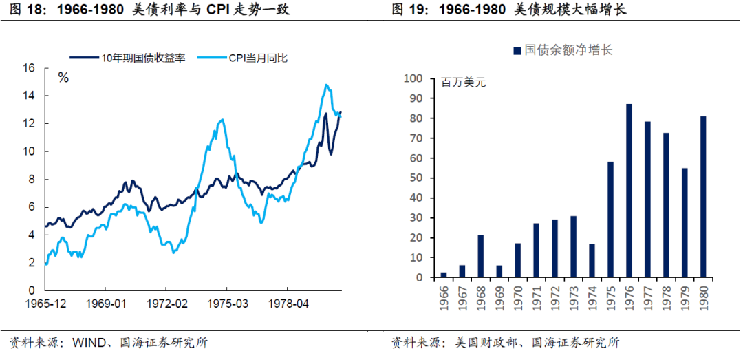 1968年,约翰逊赤字引发了第一轮通胀,美债利率随之上行,截止至1970年初,美债利率已经由5.5%上行超过230BP。随着尼克松政府的紧缩以及美联储加息,美国经济陷入衰退,通胀有所缓和,美债利率半年内回调200BP。