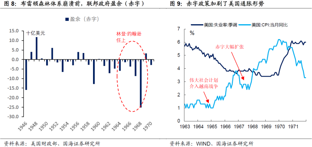 为了扩大财政、货币宽松托底经济的空间,并以货币贬值促进出口,解除金本位制度施加的桎梏,1971年尼克松单方面宣布放弃金本位,布雷顿森林体系崩溃。