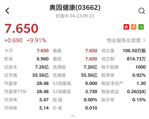 智通财经APP获悉,奥园健康(03662)发布公告,附属奥园健康生活(广州)集团有限公司拟收购乐生活80%股权,代价为人民币2.479亿元。据悉,乐生活为中国领先的物业管理服务供应商之一,物业总建筑面积约2263万平方米。截至发稿,奥园健康涨9.91%,报7.65港元,成交额814.73万港元。