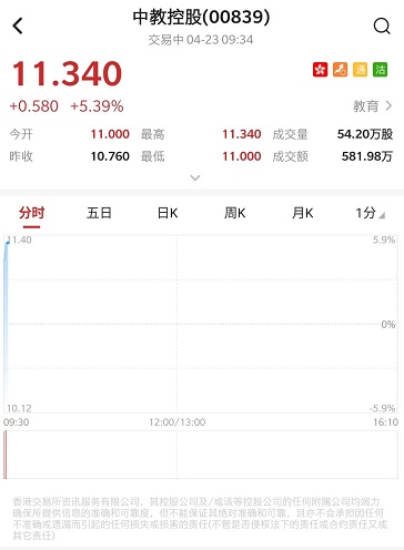 智通财经APP获悉,中教控股(00839)发布截至2020年2月29日止六个月的中期业绩,该集团期内收入为13.15亿元人民币,同比增长41.8%。纯利为5.41亿元,同比增长57.4%。截至发稿,涨5.76%,报11.38港元,成交额616.03万港元。