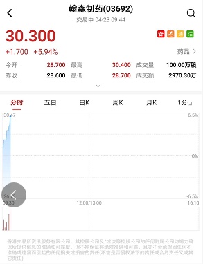 智通财经APP获悉,翰森制药(03692)拟折让约5.98%配售1.3亿股,净筹约34.77亿港元。该股早盘股价大幅上扬,截至9时44分,涨5.94%,报价30.3港元,成交额2970.3万。