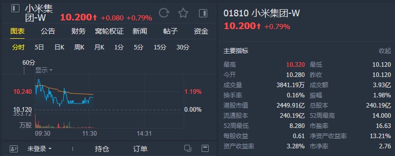 该行称,小米集团具有强劲资产负债表,预计在环球金融危机下该股可跑赢大市。该行上调对小米今年经调整盈利预测1.8%至110.72亿元人民币,并调高对小米明年经调整盈利预测4.8%至144.53亿元人民币,预计今明两年毛利率预测各为14.1%及14.3%。