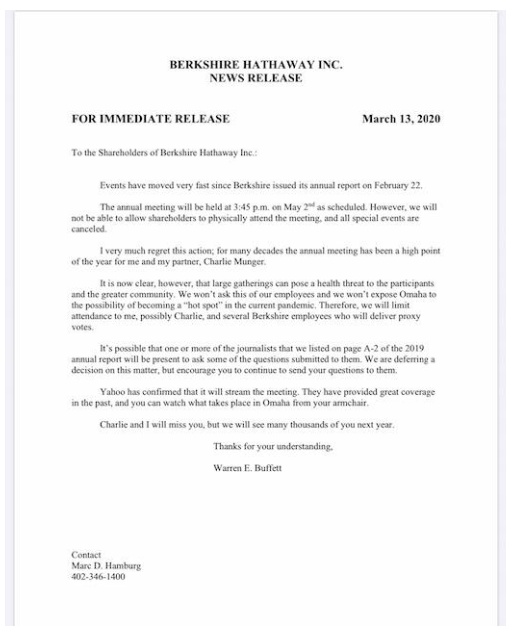 3月13日,伯克希尔·哈撒韦官网上刊发一则通知,内容是巴菲特致伯克希尔·哈撒韦公司股东的一封信。巴菲特在信中表示,在过去数十年来,股东大会一直是他和查理·芒格一年中的重要时刻。但是,现在很显然,大型聚会将对股东和整个社区构成健康威胁。他们也不会要求员工出席,因为不想使奥马哈变为当前公共卫生事件中的“热点”。