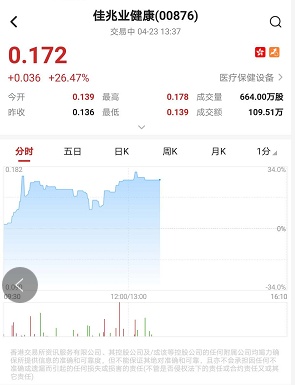 智通财经APP获悉,佳兆业健康(00876)拟设两家合营公司进一步拓展健康板块业务,截至13时37分,涨26.47%,报价0.172港元,成交额109.51万。