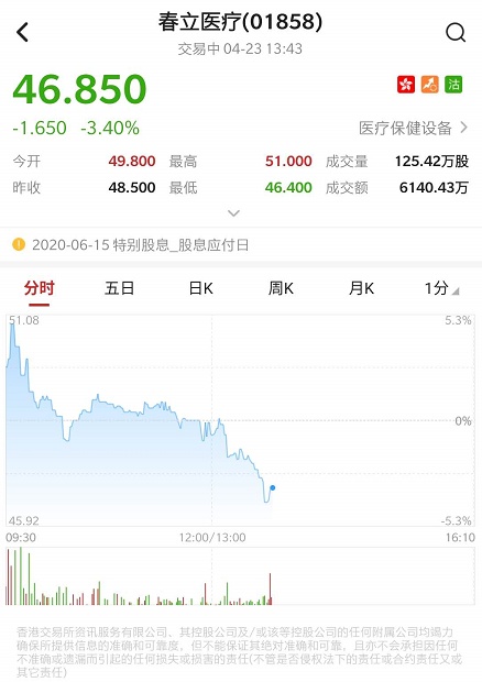 智通财经APP获悉,春立医疗(01858)发布公告,该集团现正考虑及探讨于上海证券交易所或深圳证券交易所发行以人民币进行买卖的公司普通股的可能性。该股早盘涨超5%后转跌,午后跌幅扩大逾4%。截至发稿,跌3.4%,报46.85港元,成交额6140.43万港元。