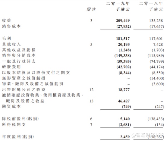 2019财年,联康生物实现收益达2.09亿港元,同比增长54.9%;公司净利润为245.9万港元,同比实现扭亏。从公司整体业绩情况不难看出,2019年公司实现扭亏为盈的因素有三点:大幅增长的营收,稳定的高毛利以及出售附属公司等获得的一次性收益。