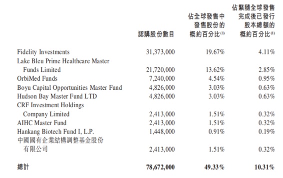 除 AIHC Master Fund、 CRF Investment Holdings Company Limited、 Hankang Biotech Fund I, L.P.、 Lake Bleu Prime Healthcare Master Fund Limited及OrbiMed Funds为公司现有股东或现有股东的紧密联系人外,其他基石投资者为独立第三方及并非公司的关连人士。